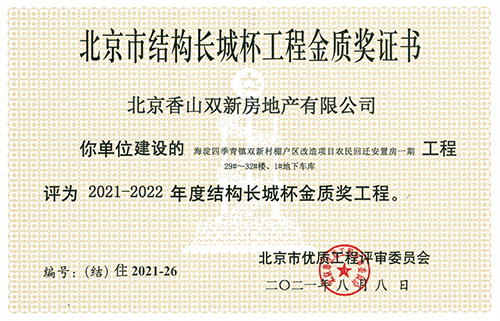 喜訊!由北京香山雙新房地產(chǎn)有限公司建設(shè)的海淀區(qū)四季青鎮(zhèn)雙新村棚戶區(qū)改造項目農(nóng)民回遷安置房一期(29#~32#樓、1#地下車庫)工程,榮獲2021-2022年度北京市建筑結(jié)構(gòu)長城杯金質(zhì)獎工程。