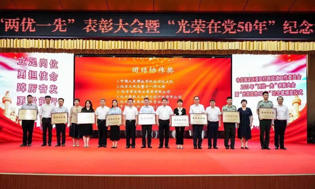 砥礪初心擔(dān)使命,踔厲奮發(fā)勇作為。在中國共產(chǎn)黨成立102周年之際,6月28日上午,田村路街道隆重舉行“迎七一 樹典型 學(xué)先進(jìn)”2023年“兩優(yōu)一先”表彰大會(huì)暨“光榮在黨50年”紀(jì)念章頒發(fā)儀式。海淀區(qū)政協(xié)副主席、田村路地區(qū)黨建工作協(xié)調(diào)委員會(huì)主任李偉,區(qū)委組織部副部長孔磊,區(qū)委宣傳部副部長刁偉梅,田村路街道及各基層黨組織、地區(qū)單位代表等參加活動(dòng)。會(huì)上,北京龍徽國際酒文化創(chuàng)意產(chǎn)業(yè)有限公司作為地區(qū)黨建工作協(xié)調(diào)委員會(huì)成員單位代表,受邀上臺(tái)榮獲了團(tuán)結(jié)協(xié)作獎(jiǎng)獎(jiǎng)牌。