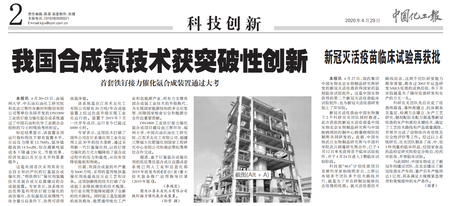 4月29日《科技日?qǐng)?bào)》發(fā)表了記者馬愛平《我國首套“鐵釕接力催化”氨合成工業(yè)裝置通過大考》的報(bào)道。