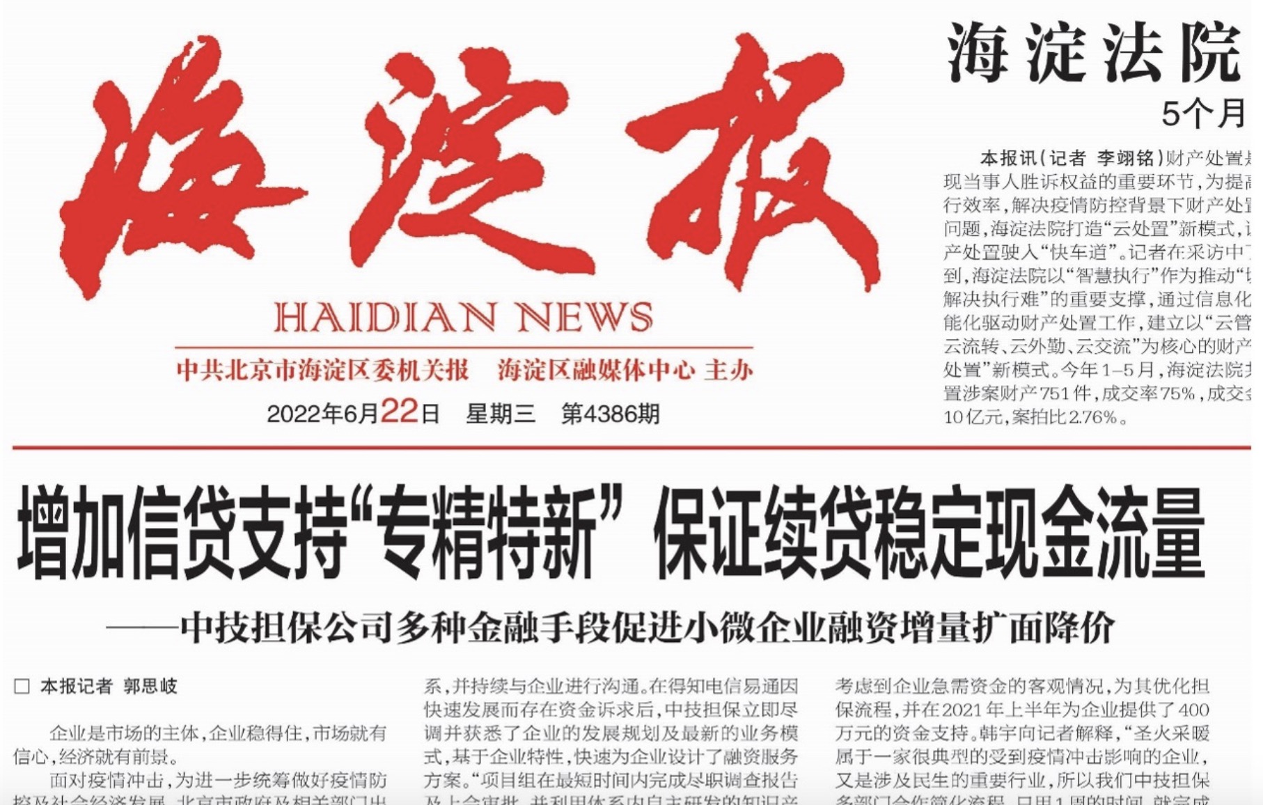 面對疫情沖擊,為進一步統(tǒng)籌做好疫情防控及社會經(jīng)濟發(fā)展,北京市政府及相關(guān)部門出臺了一系列為中小微企業(yè)紓困的相關(guān)政策,以切實減輕疫情對中小微企業(yè)生產(chǎn)經(jīng)營的影響。海國投集團旗下北京中技知識產(chǎn)權(quán)融資擔保有限公司(以下簡稱“中技擔保”)積極響應(yīng)各項政策號召,充分發(fā)揮政府性融資擔保機構(gòu)公共服務(wù)職能,切實履行國有企業(yè)社會責任,全力幫助中小微企業(yè)渡過難關(guān),為企業(yè)注入發(fā)展活力。