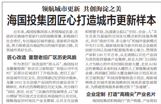 近年來,海國投集團深入貫徹海淀區(qū)委、區(qū)政府實施城市更新行動的戰(zhàn)略部署,積極踐行社會責任,專注海淀區(qū)城市建設(shè)、更新和升級改造,努力探索適合海淀特點的城市更新之路,共筑城市美好生活。
