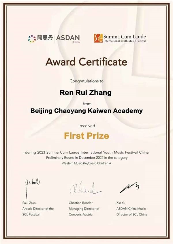 報喜2023 新年伊始,朝陽凱文的同學(xué)們在音樂、數(shù)學(xué)、化學(xué)三項賽事中嶄露頭角,收獲滿滿,喜報連連!三項重磅獎項分別是: 維也納國際青少年音樂節(jié)一等獎 美國少年化學(xué)家趣味活動優(yōu)秀獎 北美數(shù)學(xué)聯(lián)盟競賽2金5銅 在朝陽凱文,學(xué)校一直鼓勵并帶領(lǐng)同學(xué)們參與國際競賽,讓競賽不再是尖子生的專屬,而是每一位孩子都可以參與其中,充分發(fā)揮他們的興趣特長,在不同的領(lǐng)域發(fā)光發(fā)熱,收獲自信和成長。 今天,就讓我們一起看看凱文小將們在2023年,收獲了哪些驚喜吧! 維也納國際青少年音樂節(jié)一等獎 朝陽凱文3年級張壬睿同學(xué)在2023冬季“至高榮耀”維也納國際青少年音樂節(jié)(線上雨軒站)活動中,獲得西洋樂初賽一等獎的好成績,順利進入全國總決賽,并有機會獲得2023年暑假前往維也納金色大廳的演出機會!