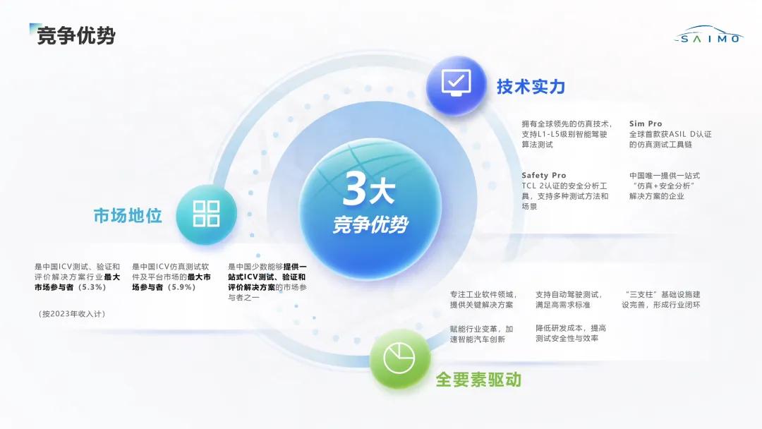 據(jù)介紹,智能網(wǎng)聯(lián)汽車(ICV)仿真測試領(lǐng)域具有廣闊的市場前景。根據(jù)弗若斯特沙利文數(shù)據(jù),中國ICV行業(yè)市場規(guī)模預(yù)計從2023年的1653億元增長至2030年的6596 億元,年均復(fù)合增長率約20.1%;其中ICV 測試、驗證和評價解決方案行業(yè)市場規(guī)模將以 33.6%的年均復(fù)合增長率增長至279億元。賽目科技致力于解決行業(yè)關(guān)鍵痛點,并持續(xù)創(chuàng)新,為行業(yè)提供全面的工具鏈解決方案。工具鏈以Sim Pro(仿真平臺)和Safety Pro(綜合安全分析工具)為核心,兩款產(chǎn)品已通過ISO 26262標準的功能安全認證,成為賽目科技技術(shù)壁壘和利潤增長點的重要組成部分。憑借技術(shù)優(yōu)勢和市場前瞻性,賽目科技正成為智能駕駛從概念邁向規(guī)?;涞氐摹半[形引擎”,也是這一高速增長中的最大受益者。