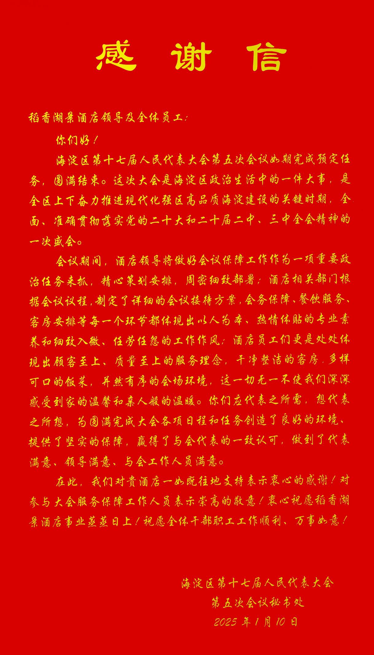 稻發(fā)公司的服務(wù)保障工作受到了來自代表們的廣泛贊譽(yù),并收到了大家的感謝信和表揚(yáng)信。